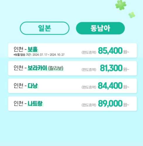 - 동남아(14,900원부터~시작): 다낭 84,400원~ / 나트랑 89,000원~ / 칼리보 81,300원~ / 보홀 85,400원~