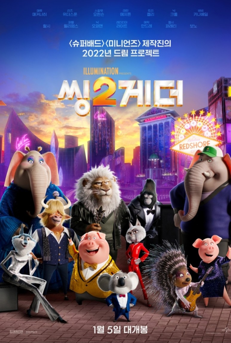 2016년 개봉한 영화 씽의 후속 편으로 씽2게더는 눈과 귀를 사로잡는 화려한 스케일로 콘서트를 보는 듯한 영화라 할 수 있습니다. 개봉일자는 2022년 1월로 감독은 가스 제닝스이고 등급은 전체 관람가입니다. 러닝타임은 110분으로 1시간 50분 정도 되는 영화지만 지루 할 틈이 없을 정도로 몰입을 하게 만든 3D 애니메이션 영화입니다. 어른과 어린이의 마음을 사로 잡힐 만큼 50만 관객을 돌파하였습니다.