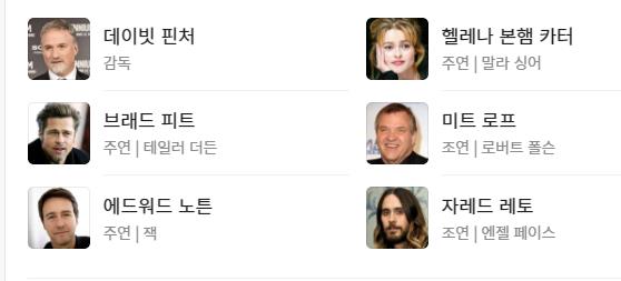 - 출연진: 브래드 피트, 에드워드 노튼, 헬레나 본햄 카더, 미트 로프, 자레드 레토 등